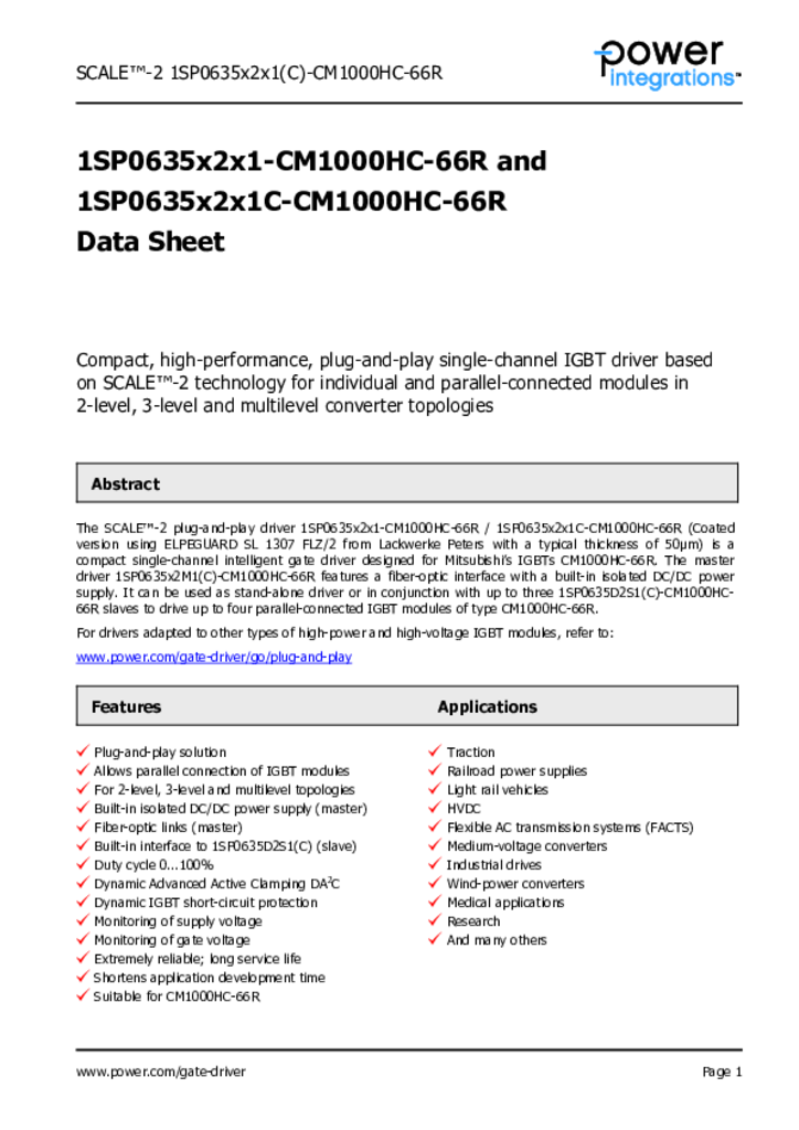 1SP0635x2xx-CM1000HC-66R数据表 单通道即插即用驱动器,适用于1200V至3300V的igbt,带板载DC/DC转换器 PDF보기 PDF다운로드 애플리케이션 제품 1 sp0635