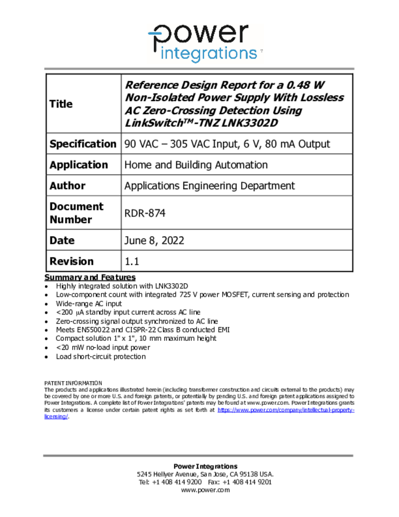 RDR-874 - 0.48 W非隔离电源,使用LinkSwitch-TNZ无损产生交流过零信号