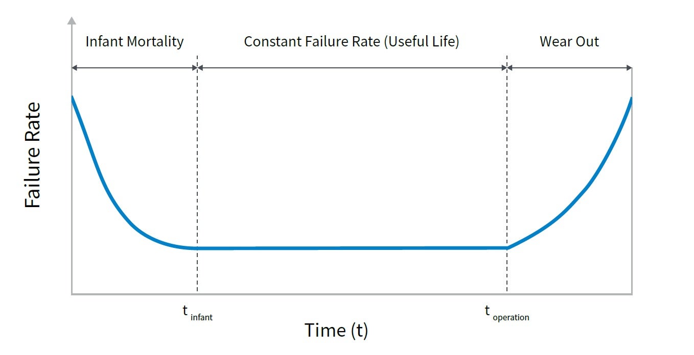 半导体的典型寿命和故障率可以用浴缸曲线.许多失败发生在手术生命的早期阶段(婴儿死亡率)。通过提高测试期间的温度,故障机制加速,以消除任何早期的设备故障。